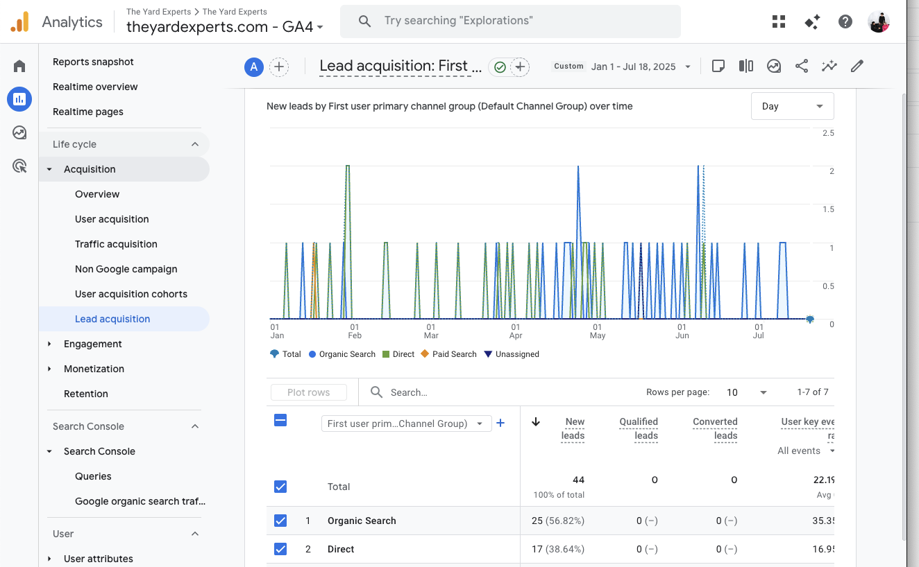 When we began working with The Yard Experts, a landscaping company in Queen Creek, AZ, they were averaging roughly 5 to 9 leads per month from Google. Despite offering strong local services, their website was not ranking for the terms that mattered most, and their ad spend was not producing consistent results. Our goal was to completely restructure their online presence, optimizing both paid and organic channels, to create a predictable, scalable system that generated real inbound leads, not just clicks.